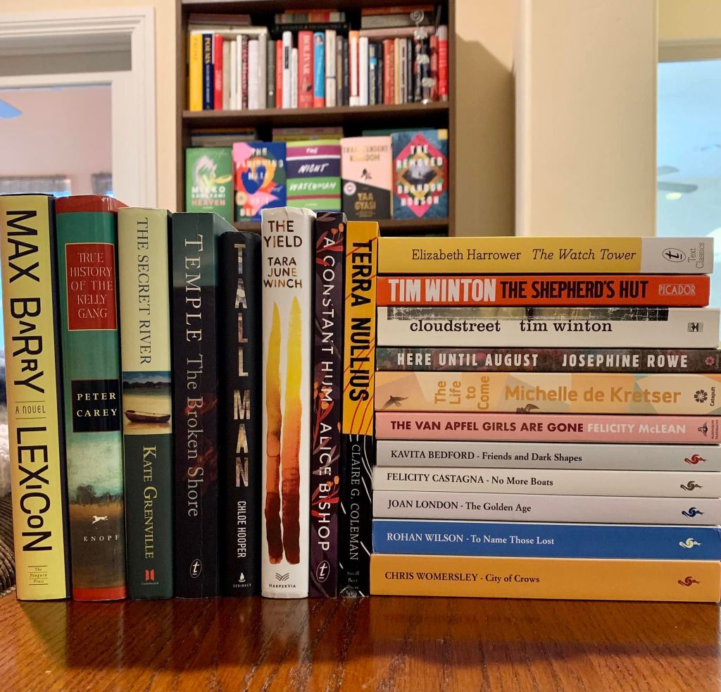 Note: While putting together the books for the accompanying photo, I inadvertently omitted books by Charlotte Wood (“The Natural Way of Things”) and Heather Rose (“The Museum of Modern Love”), both of which won the Stella Prize, awarded to the best work of fiction by an Australian woman. I also neglected to include anything from one of Australia’s greatest writers, Richard Flanagan. I recommend “The Narrow Road to the Deep North,” which won the Booker Prize in 2014. Of all the books to overlook, right? 😉