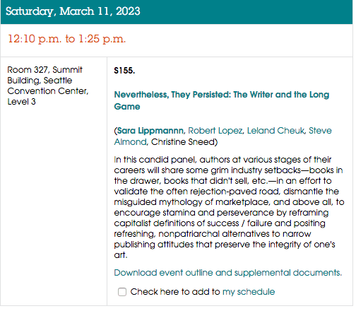 Another writer I think of as very successful, still alive and well, Steve Almond, made a related comment last week at the AWP conference (on a panel assembled by the novelist Sara Lippmann: Nevertheless, They Persisted) that I’ve continued to think about: “A writer’s job is to outlast doubt.”