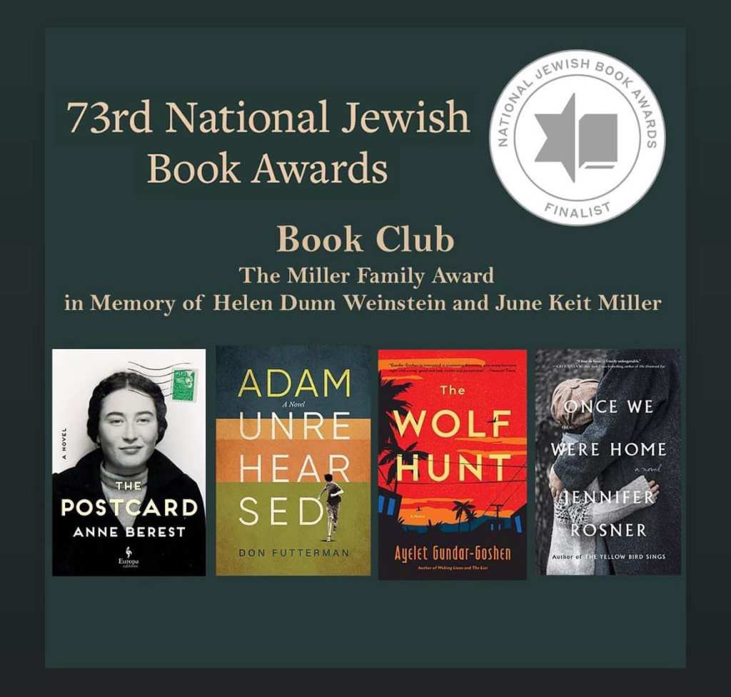 The finalists for the Book Club award were The Postcard by Anne Berest (my choice for Best Book of 2023), Adam Unrehearsed by Don Futterman, The Wolf Hunt by Ayelet Gundar-Goshen, and Once We Were Home by Jennifer Rosner.