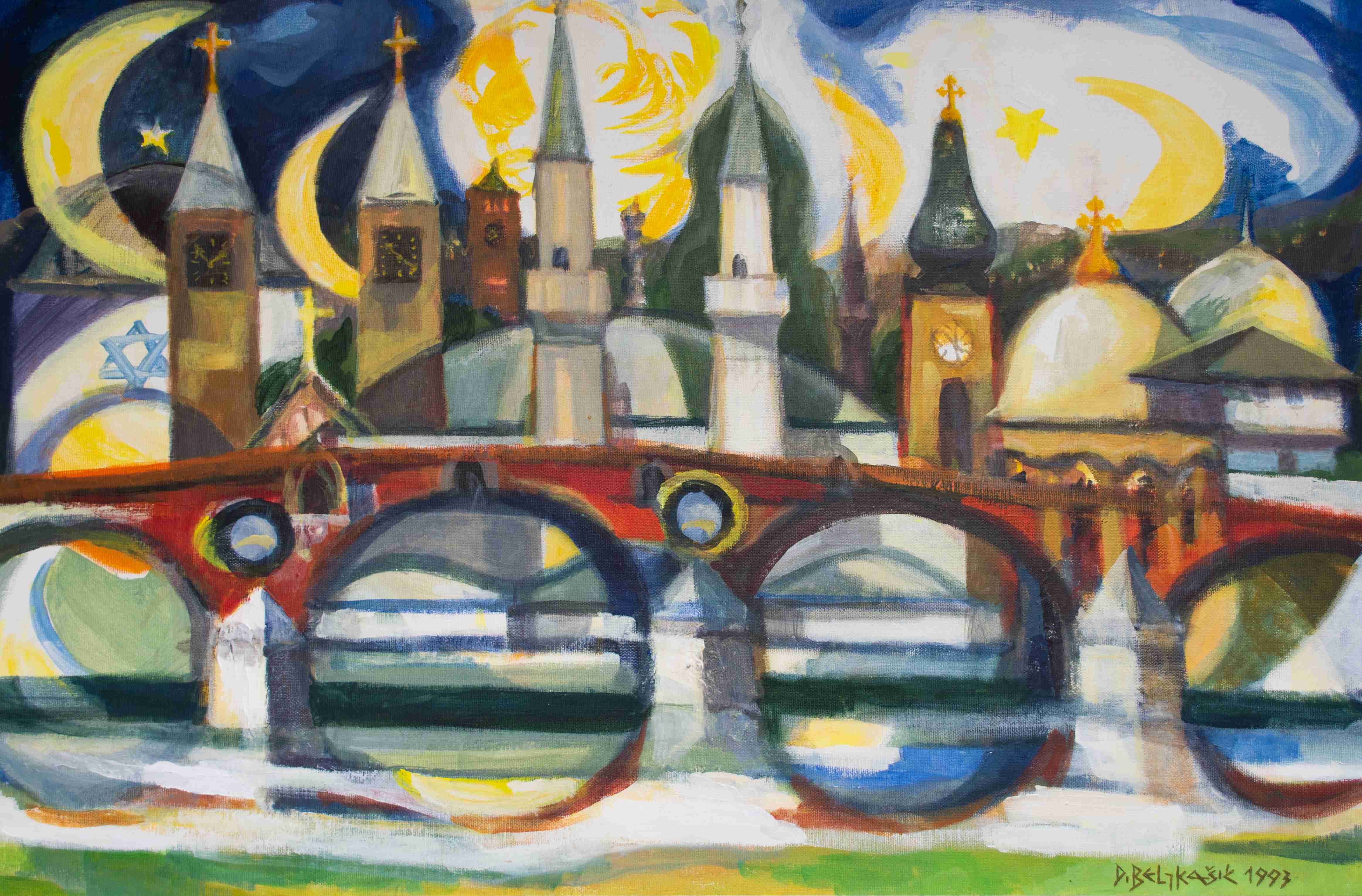 “Memories of Sarajevo” by Dobrivoje Beljkašić, 1993. This was one of the first paintings my great-uncle Dobri painted after he, his wife and mother-in-law left Sarajevo on the last Red Cross Convoy out of the besieged city in November 1992.