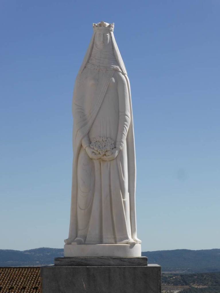 My girl did wait, and I traveled three times to Spain, Portugal, France and Germany to way find her journey. On that long-ago bicycle trip, the next stop after the standing stones was Estremoz, where the beautiful statue of Santa Isabel stands larger than life, commemorating that queen’s selfless acts of charity, risking her life by defying her husband in order to feed the poor. My character’s name became Isabela, and she too would have to risk her life to aid others.