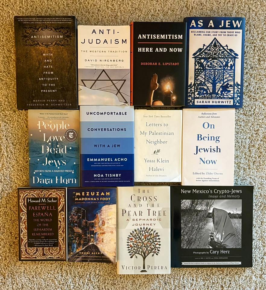 The bottom row features books about Spanish Jewry and their descendants (Sephardic Jews). Crypto-Jews live in New Mexico and Mexico. They are descendants of Sephardic Jews during the Inquisition who converted to Catholicism for their own safety but continued to practice Judaism or observe certain rituals like lighting candles at the start of Shabbat. Eventually, most made their way to the New World. Generations later, these crypto-Jews discover their Jewish ancestry and either resume some elements of Jewish observance or convert back to Judaism. It’s a fascinating story.